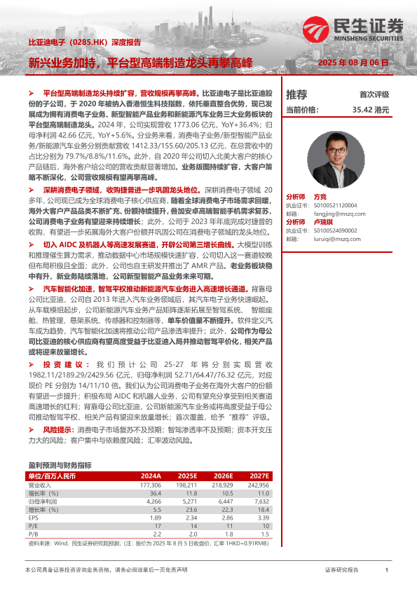 【民生证券】【202508】比亚迪电子(0285.HK)深度报告:新兴业务加持,平台型高端制造龙头再攀高峰-30页