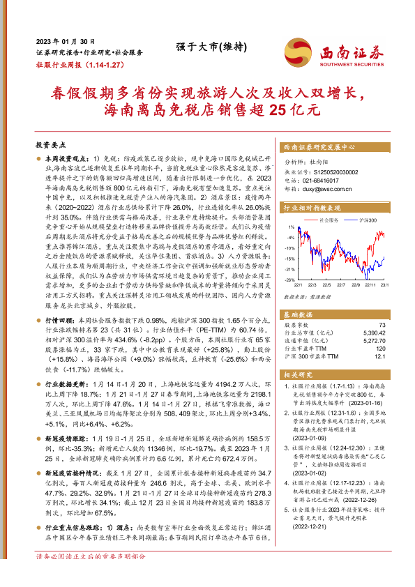 【西南证券】【20230130】社服行业周报:春假假期多省份实现旅游人次及收入双增长,海南离岛免税店销售超25亿元-22页