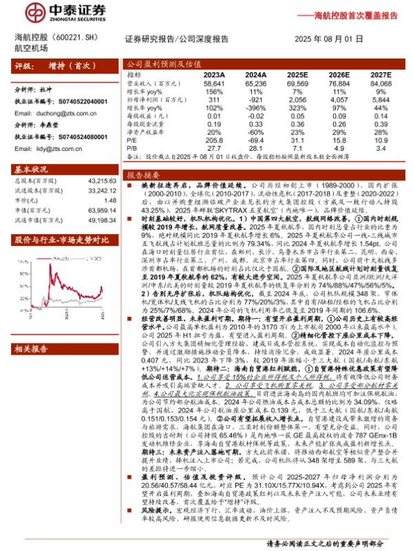 方大集团 海航控股 海南自贸港 航空业 盈利预测