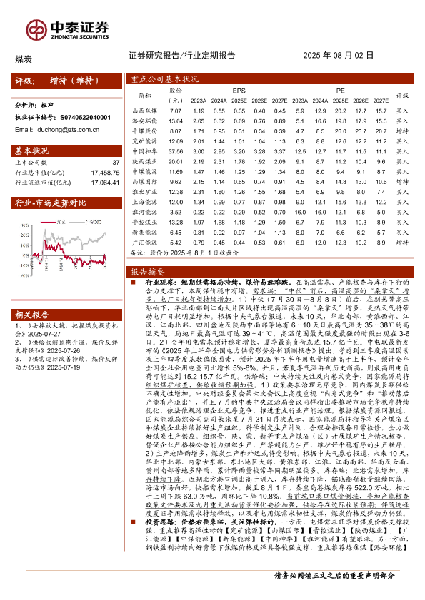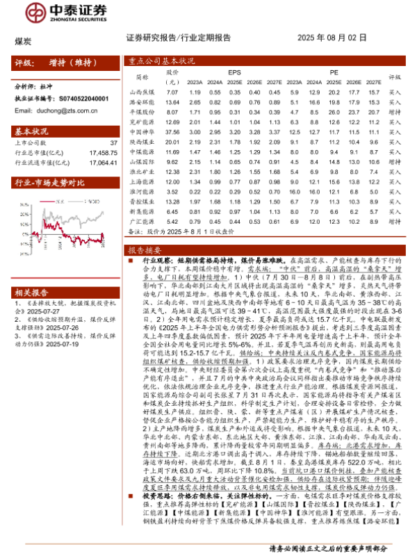 【中泰证券】【202508】煤炭行业:短期基本面偏强,煤价升势料延续-23页