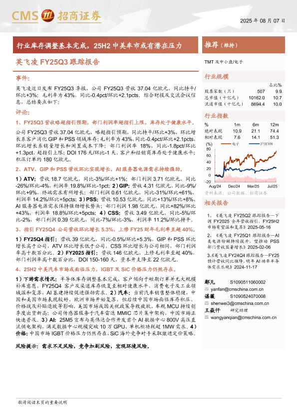 【海通证券】【202508】电子行业英飞凌FY25Q3跟踪报告:行业库存调整基本完成,25H2中美车市或有潜在压力-13页