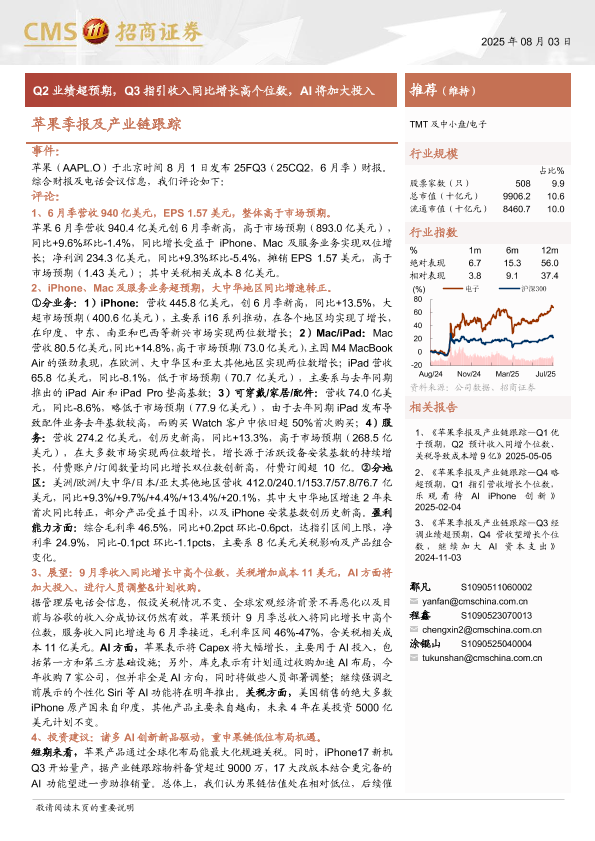 【海通证券】【202508】苹果季报及产业链跟踪:Q2业绩超预期,Q3指引收入同比增长高个位数,AI将加大投入-13页