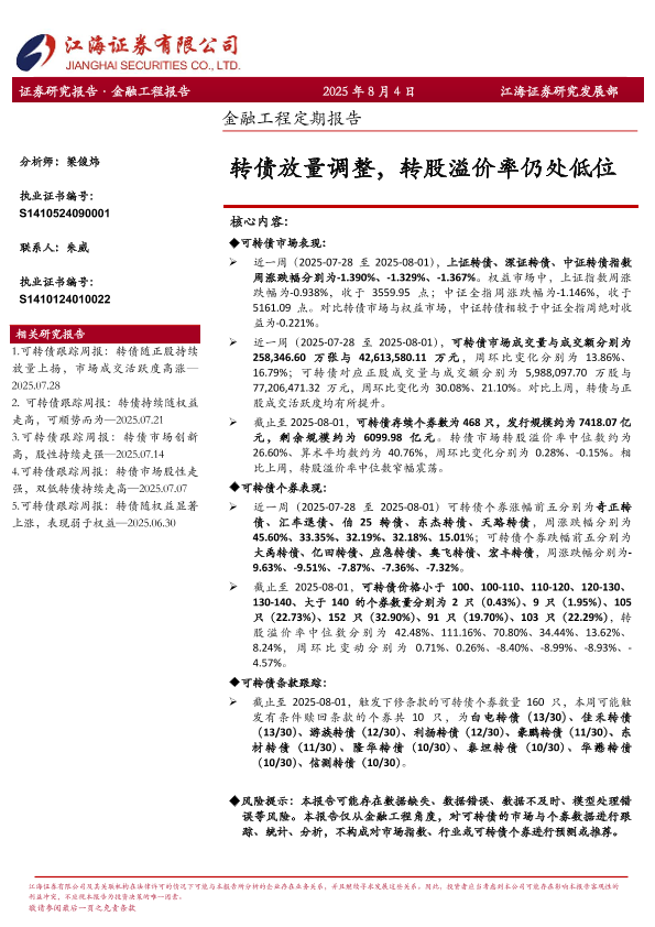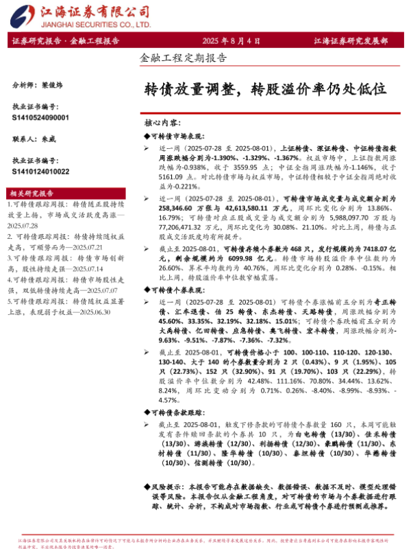 【江海证券】【202508】转债放量调整,转股溢价率仍处低位-12页