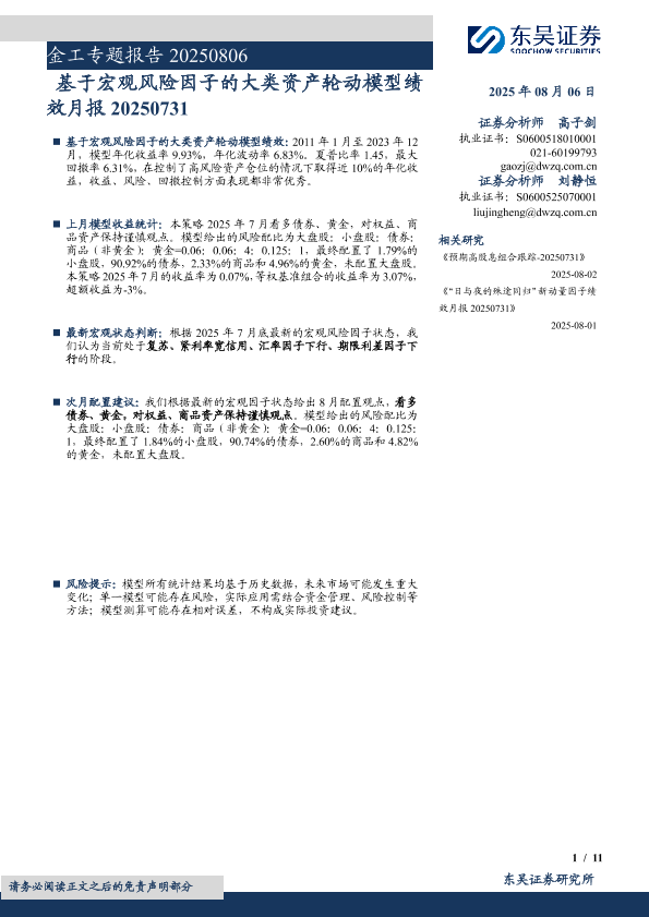 【东吴证券】【202508】基于宏观风险因子的大类资产轮动模型绩效月报-11页