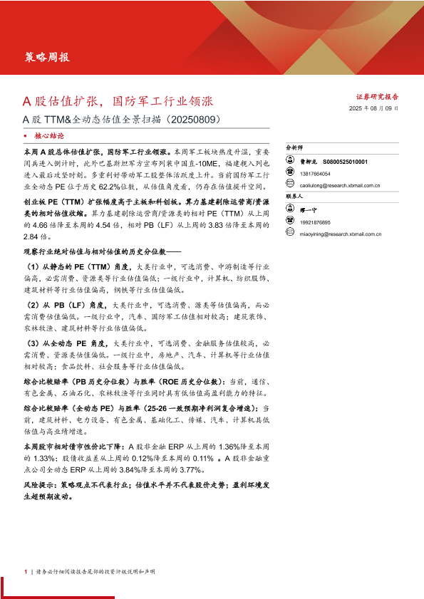 【西部证券】【202508】A股估值扩张,国防军工行业领涨-16页