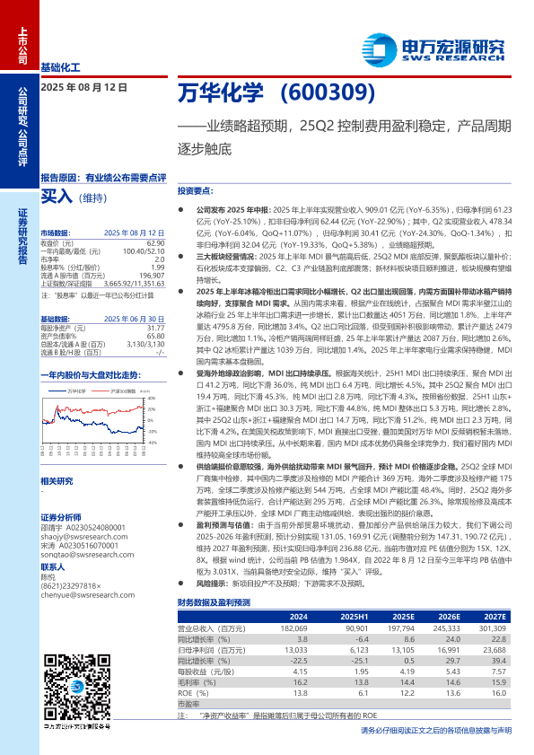 【申万宏源】【202508】万华化学(600309)——业绩略超预期,25Q2控制费用盈利稳定,产品周期逐步触底-10页