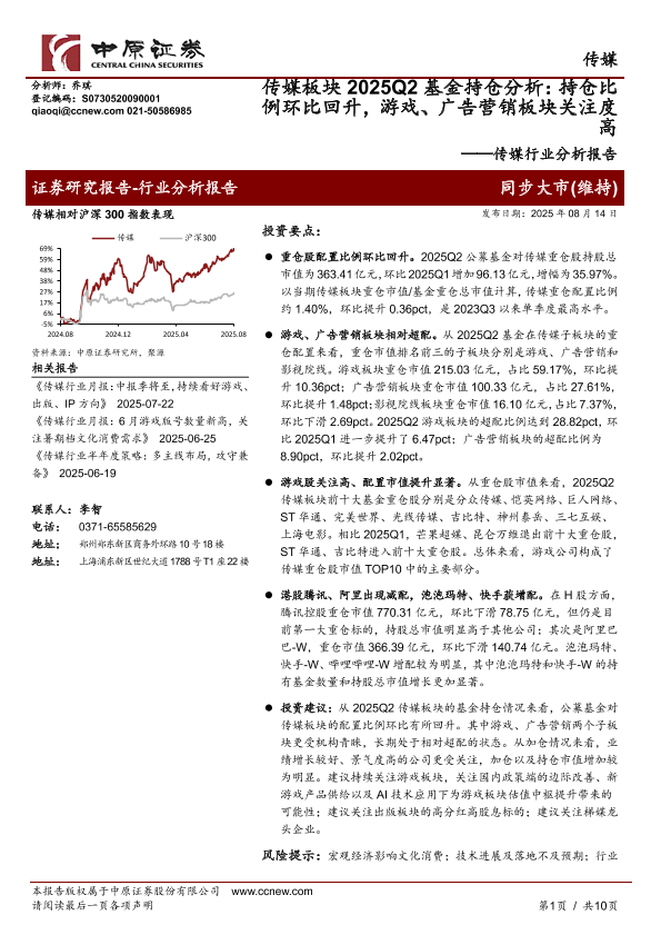 【中原证券】【202508】传媒板块2025Q2基金持仓分析:持仓比例环比回升,游戏、广告营销板块关注度高-10页