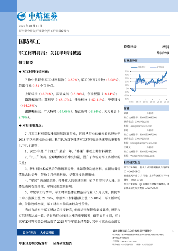【中航证券】【202507】军工行业材料月报:关注半年报披露-16页