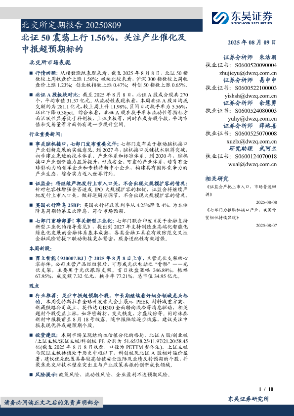 【东吴证券】【202508】北证50震荡上行1.56%,关注产业催化及中报超预期标的-10页