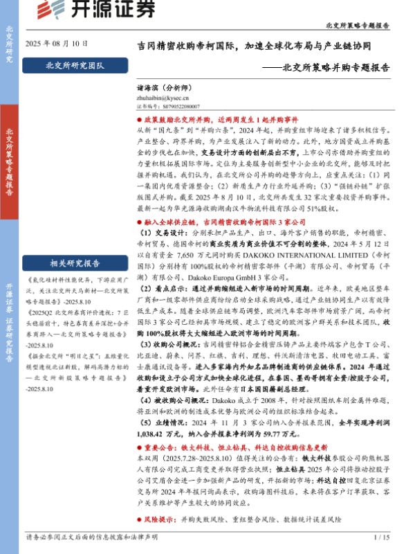 【开源证券】【202508】北交所策略并购专题报告:吉冈精密收购帝柯国际,加速全球化布局与产业链协同-15页