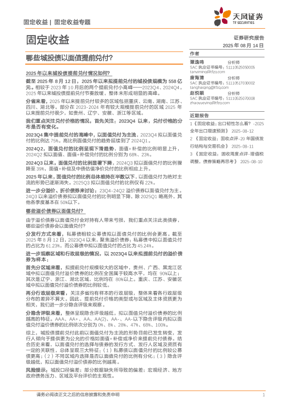 【天风证券】【202508】固定收益专题:哪些城投债以面值提前兑付?-10页