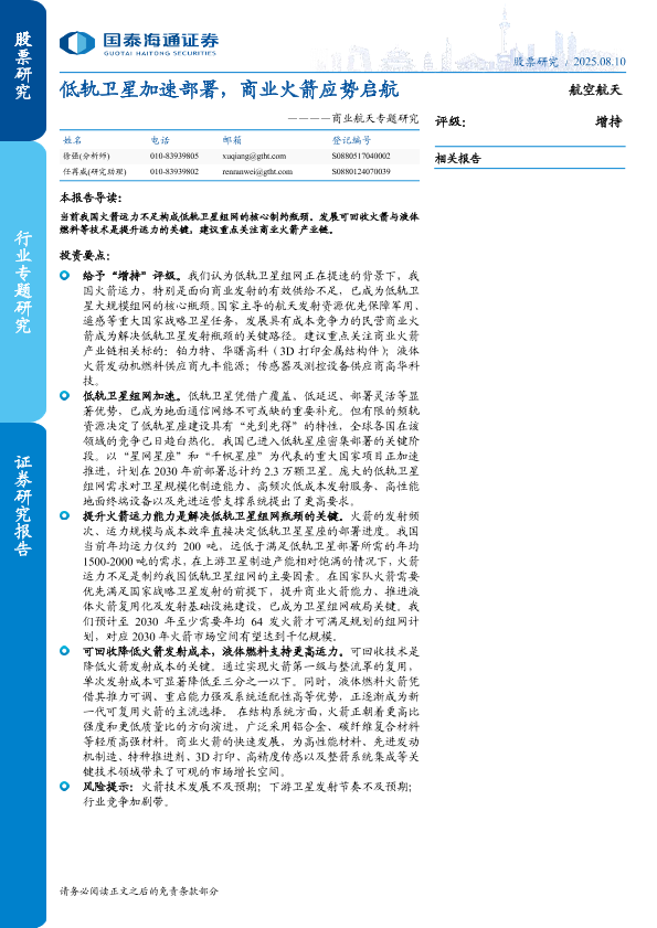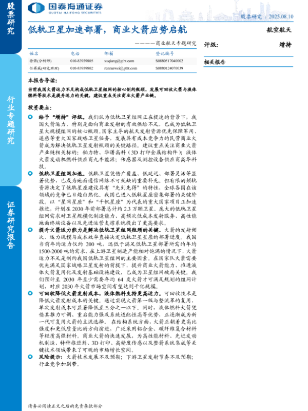 【国泰海通证券】【202508】低轨卫星加速部署,商业火箭应势启航-32页