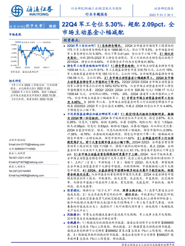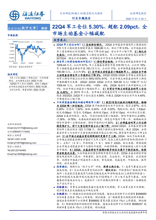【海通证券】【20230130】航空航天与国防行业专题报告:22Q4军工仓位5.30%、超配2.09pct,全市场主动基金小幅减配-19页