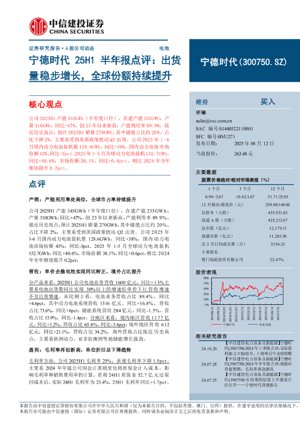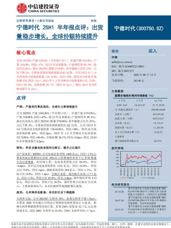 【中信建投证券】【202508】宁德时代 25H1半年报点评:出货量稳步增长,全球份额持续提升-16页