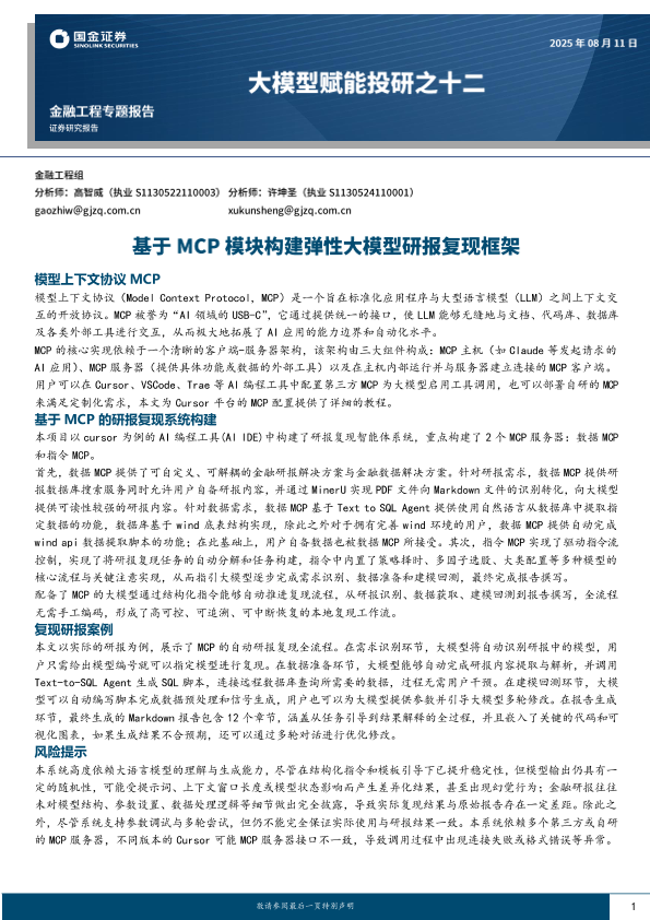【国金证券】【202408】大模型赋能投研之十二:基于MCP模块构建弹性大模型研报复现框架-17页