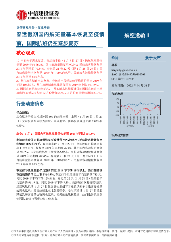 【中信建投证券】【20230131】航空运输Ⅱ行业:春运假期国内航班量基本恢复至疫情前,国际航班仍在逐步复苏-25页