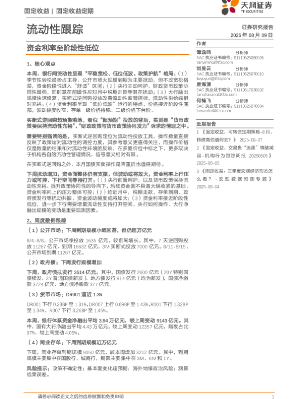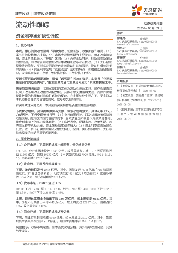【天风证券】【202508】流动性跟踪:资金利率至阶段性低位-22页