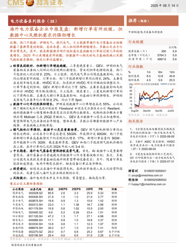 【海通证券】【202508】海外电力装备企业中报复盘:新增订单有所放缓,但数据中心及燃机需求仍强劲增长-16页