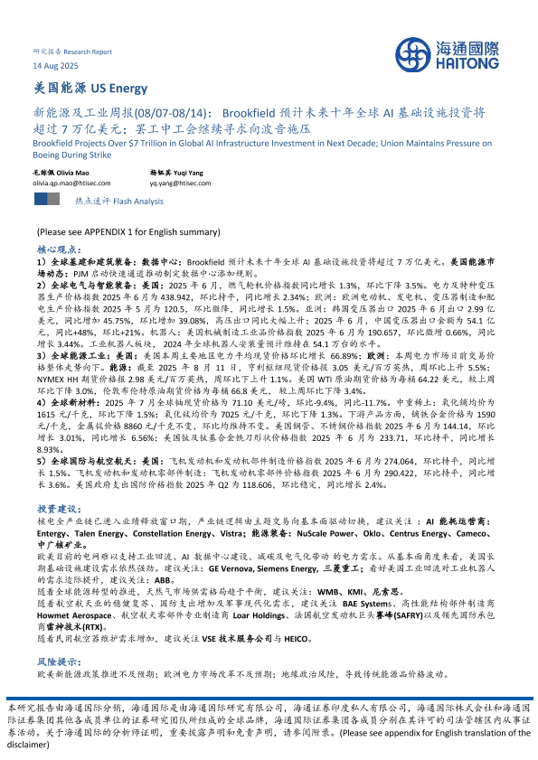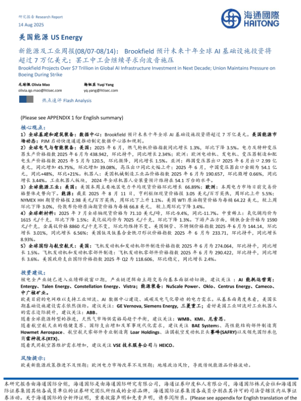 【海通国际】【202508】美国能源行业新能源及工业周报:Brookfield预计未来十年全球AI基础设施投资将超过7万亿美元;罢工中工会继续寻求向波音施压-39页