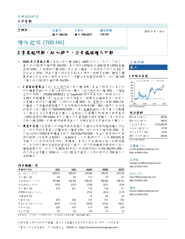 投资评级 二季度业绩 业务增长 腾讯控股 AI技术