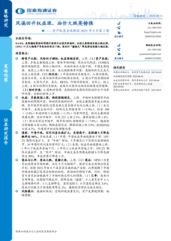 【国泰海通证券】【202508】资产配置全球跟踪2025年8月第2期:风偏回升权益涨,油价大跌英镑强-12页