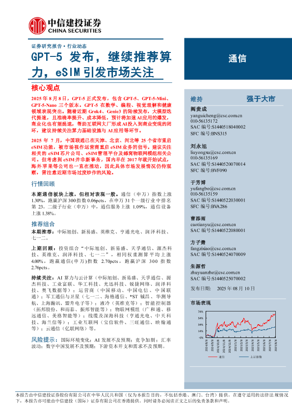 【中信建投证券】【202508】通信行业:GPT-5发布,继续推荐算力,eSIM引发市场关注-10页