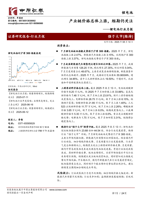 【中原证券】【202508】锂电池行业月报:产业链价格总体上涨,短期仍关注-24页