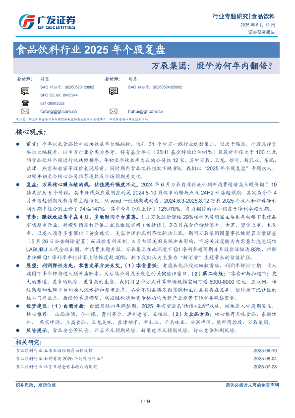 【广发证券】【202508】食品饮料行业2025年个股复盘:万辰集团,股价为何年内翻倍?-14页