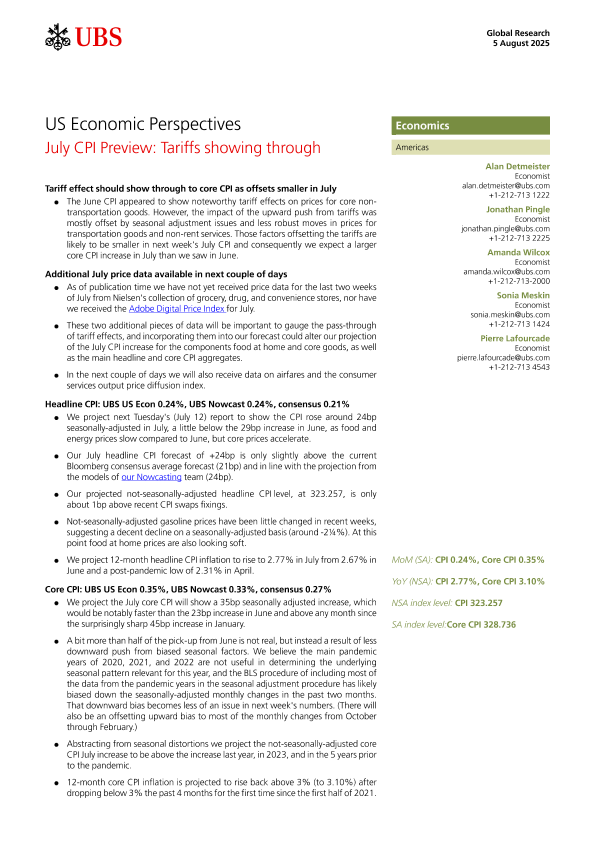 【UBS】【202507】US Economic Perspectives July CPI Preview Tariffs showing through-12页