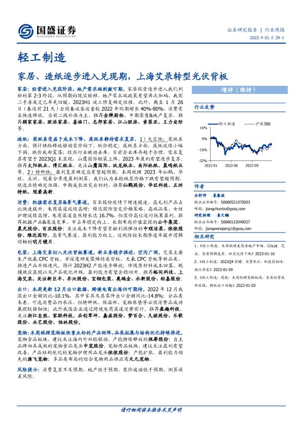 【国盛证券】【20230129】轻工制造行业周报:家居、造纸逐步进入兑现期,上海艾录转型光伏背板-51页