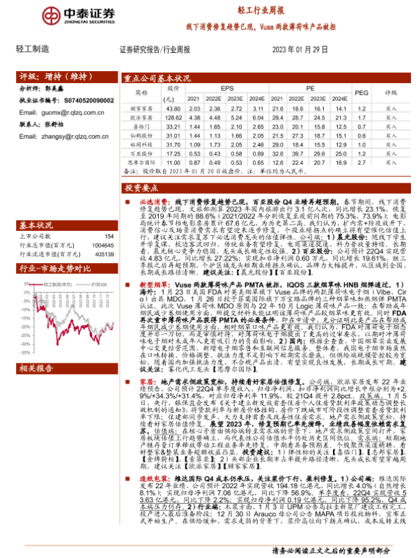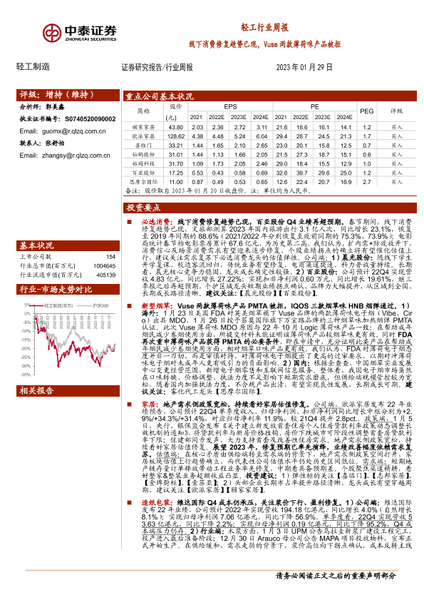 【中泰证券】【20230129】轻工行业周报:线下消费修复趋势已现,Vuse两款薄荷味产品被拒-16页