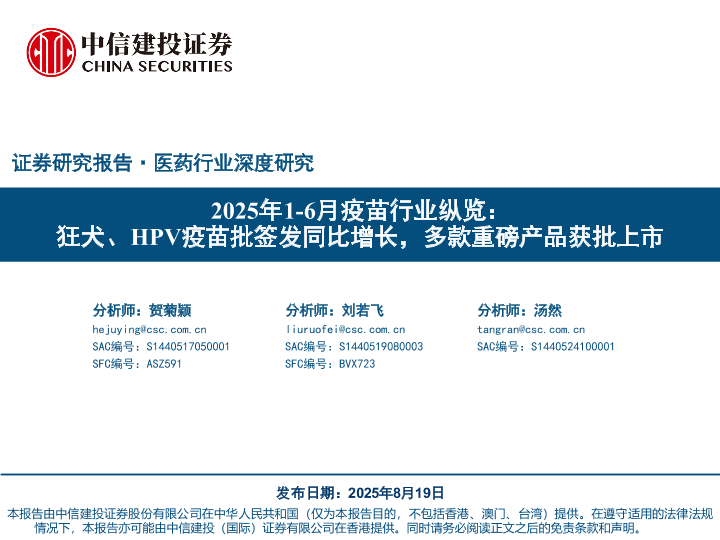 【中信建投证券】【202508】2025年1-6月疫苗行业纵览:狂犬、HPV疫苗批签发同比增长,多款重磅产品获批上市-76页