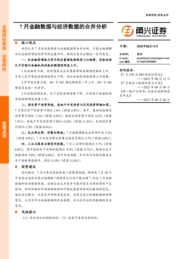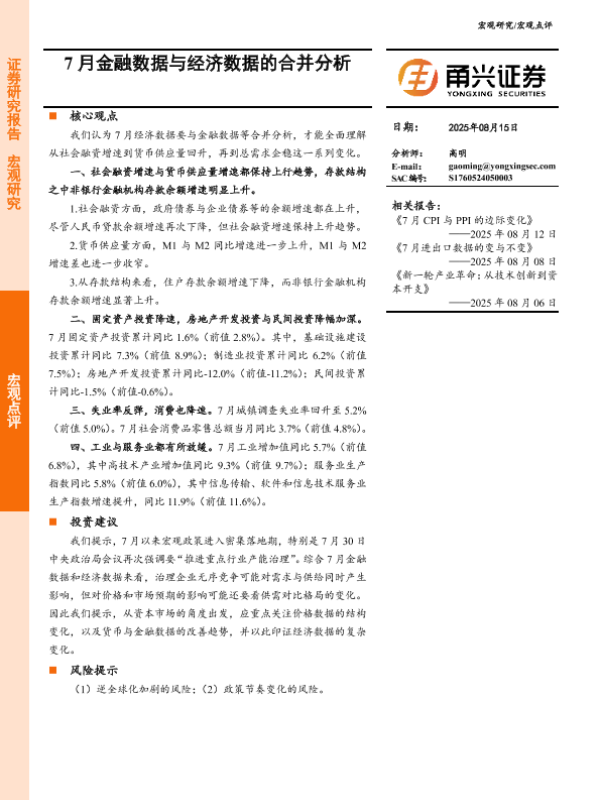 【甬兴证券】【202508】7月金融数据与经济数据的合并分析-10页
