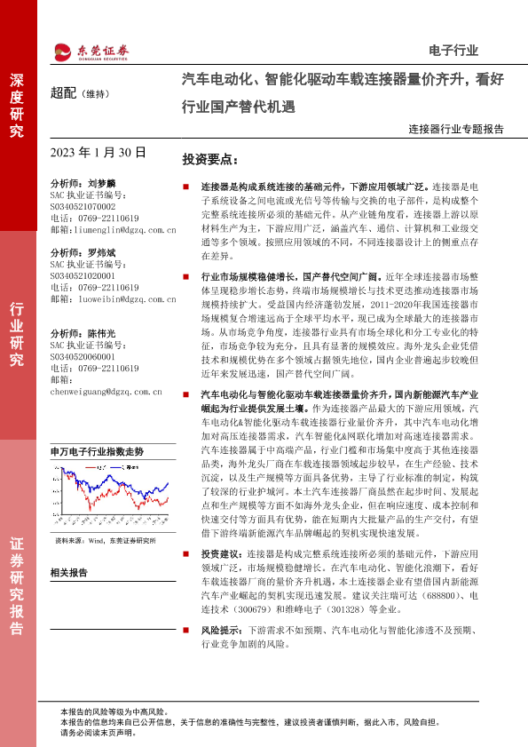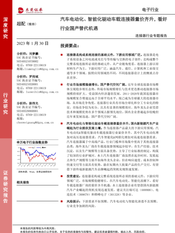 【东莞证券】【20230130】连接器行业专题报告:汽车电动化、智能化驱动车载连接器量价齐升,看好行业国产替代机遇-27页