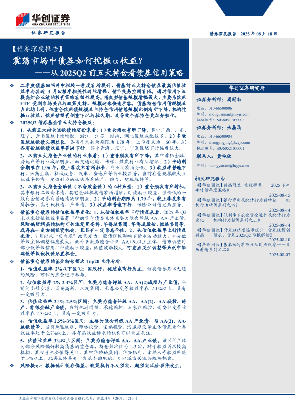 【华创证券】【202508】从2025Q2前五大持仓看债基信用策略:震荡市场中债基如何挖掘α收益?-20页