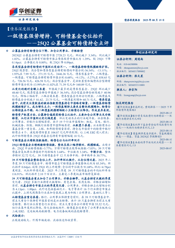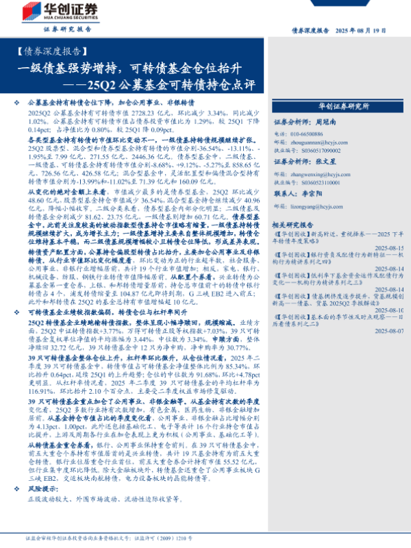 【华创证券】【202508】25Q2公募基金可转债持仓点评:一级债基强势增持,可转债基金仓位抬升-24页