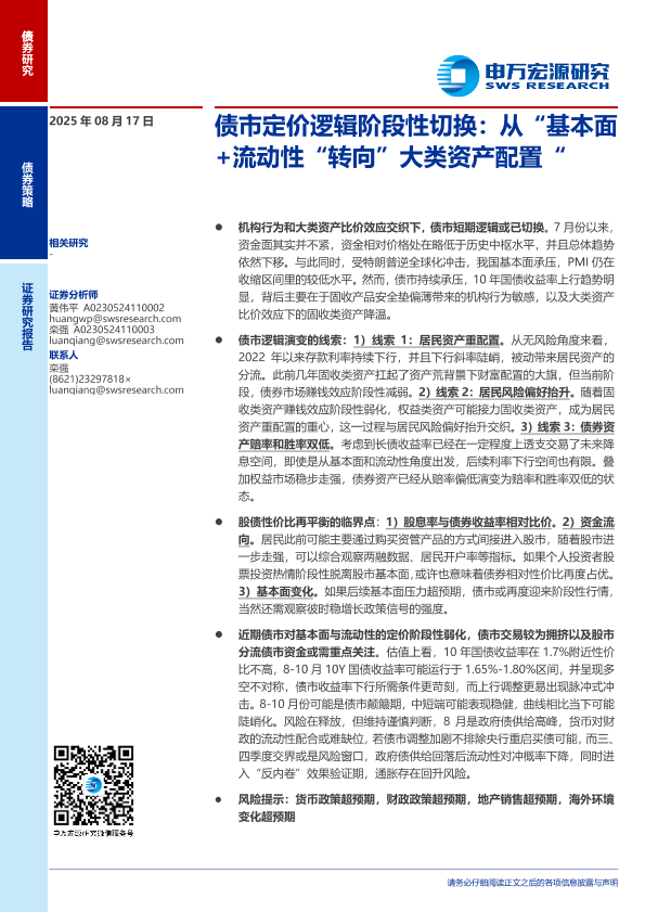 【申万宏源】【202508】债市定价逻辑阶段性切换:从“基本面+流动性”转向“大类资产配置”-10页