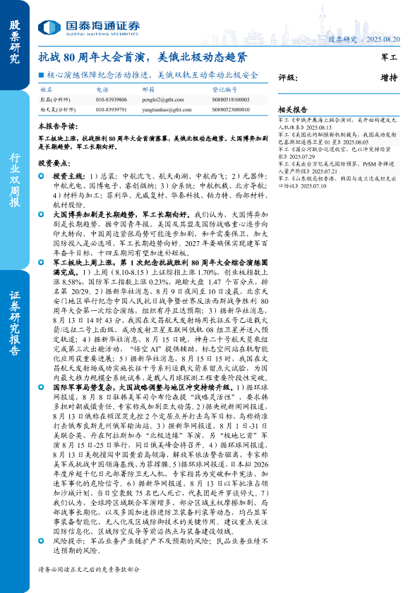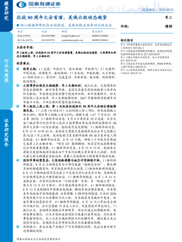 【国泰海通证券】【202508】军工行业:抗战80周年大会首演,美俄北极动态趋紧-15页