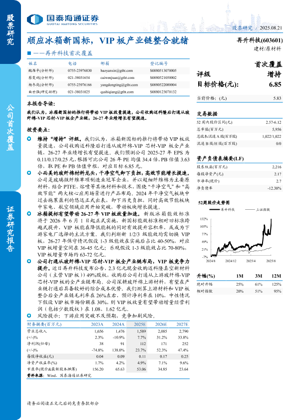 【国泰海通证券】【202508】顺应冰箱新国标,VIP板产业链整合就绪——再升科技首次覆盖-11页