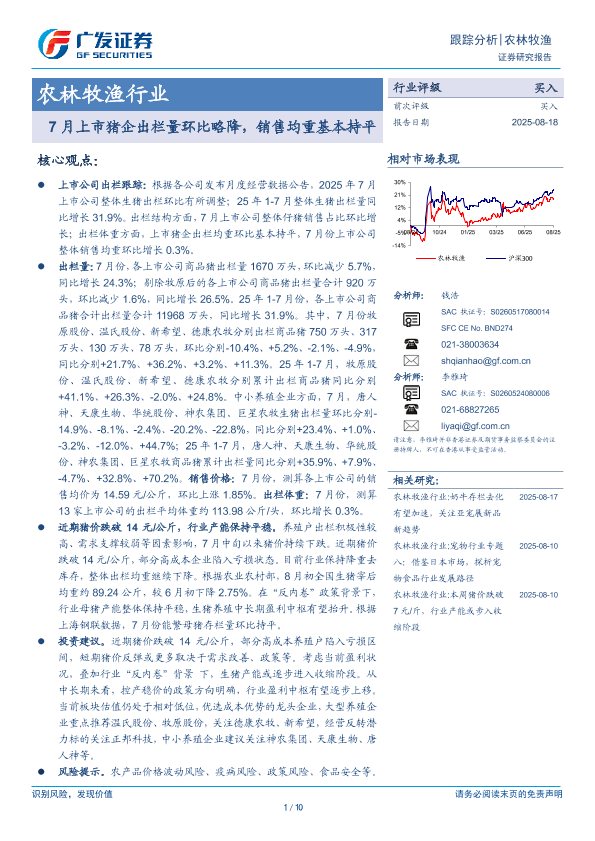 【广发证券】【202508】农林牧渔行业:7月上市猪企出栏量环比略降,销售均重基本持平-10页