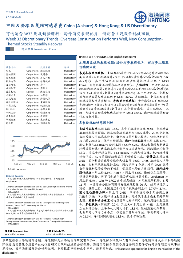 【海通国际】【202508】可选消费 W33周度趋势解析:海外消费表现优异,新消费主题股价稳健回暖-15页