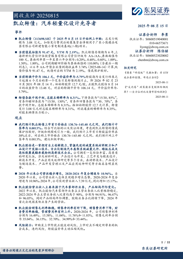 【东吴证券】【202508】固收点评:凯众转债,汽车轻量化设计先导者-11页