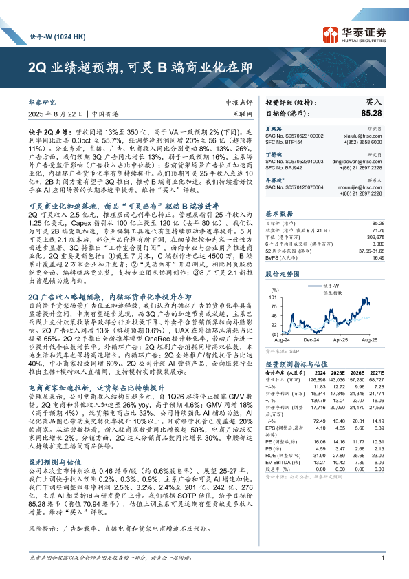 【华泰证券】【202508】快手-W(1024 HK)2Q业绩超预期,可灵 B端商业化在即-10页
