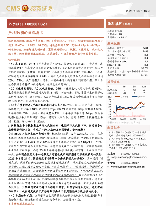江阴银行 非息收入增长 息差回升 资产质量改善 严格账期