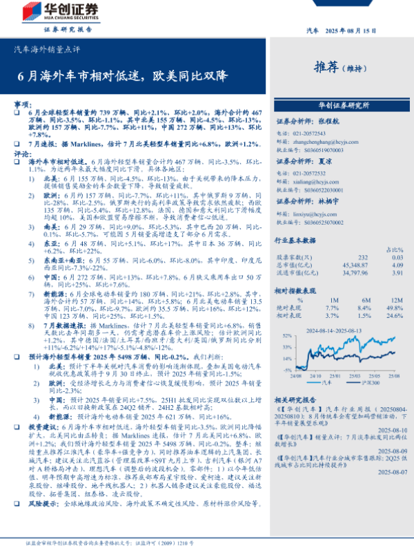 【华创证券】【202508】汽车海外销量点评:6月海外车市相对低迷,欧美同比双降-14页