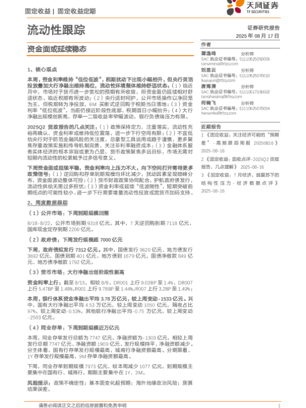 【天风证券】【202508】流动性跟踪:资金面或延续稳态-22页