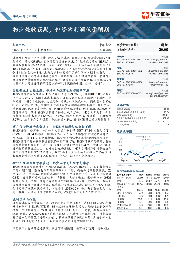 【华泰证券】【202508】港铁公司(66 HK)物业处收获期,但经常利润低于预期-10页