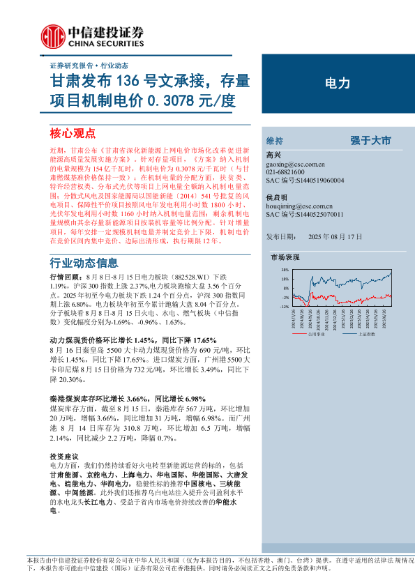 【中信建投证券】【202508】甘肃发布136号文承接,存量项目机制电价0.3078元/度-15页