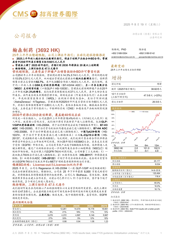【招商证券国际】【202508】Hansoh Pharma ( 3692 HK ) - 1H25 results beat, raise FY25 guidance; Globalisation underway-14页