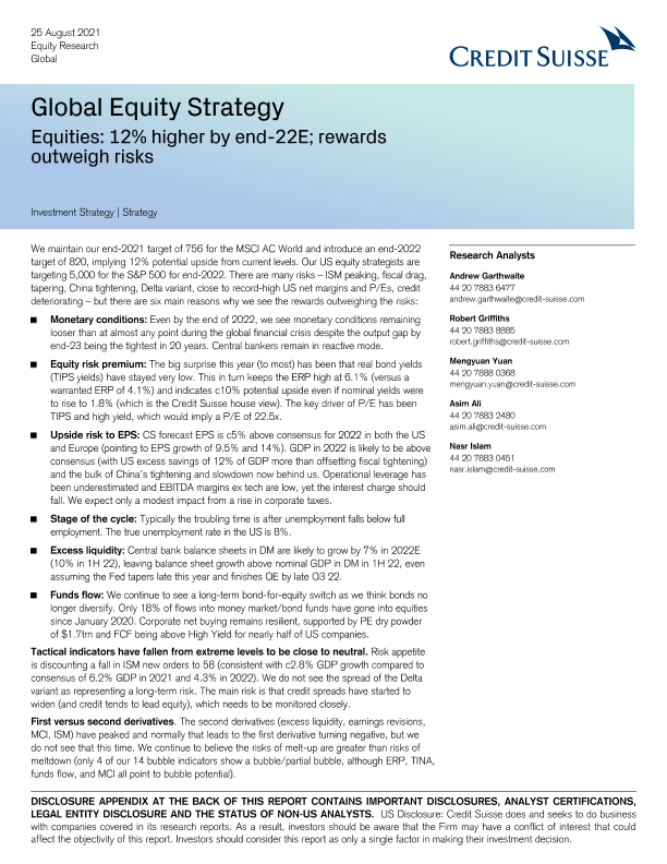 【瑞信(Credit Suisse)】【20210825】瑞信-全球投资策略-股票:到2022年底上涨12%;回报大于风险-41页